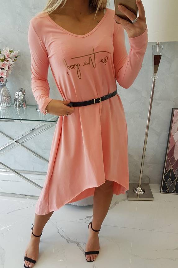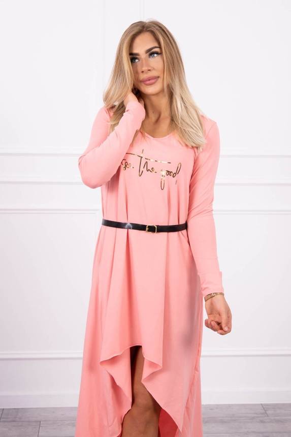 Prezentujemy Państwu wygodną sukienkę z ozdobnym paskiem oraz modnym napisem z przodu. Sukienka posiada dłuższy tył. Sukienka wykonana jest z wysokiej jakości materiału. Bardzo ciekawa propozycja dla wszystkich Pań. Rozmiar jest uniwersalny i będzie odpowiedni dla Pań noszących rozmiar S, M lub L.