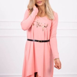 Sukienka z ozdobnym paskiem i napisem morelowa